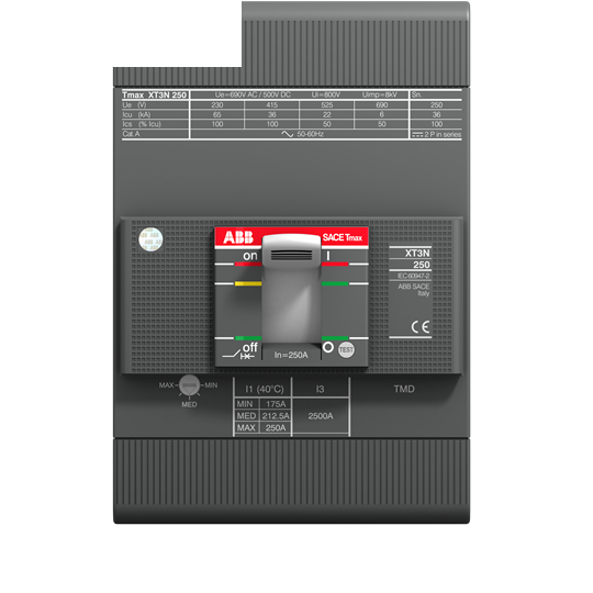 Description:Switch XT3S, Icu (415V) 50kA, 250A- TMD term.tico thermostat with adjustable thermal threshold and fixed magnetic 250-2500 3-pole fixed with front terminals.
