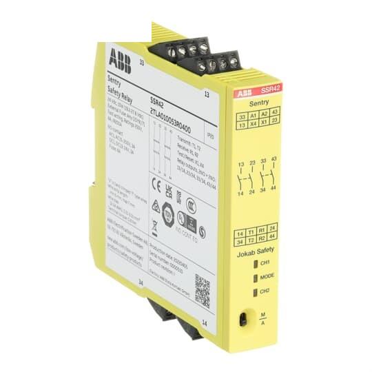 Product Introduction 2TLA010053R0400 ABB - Sentry SSR42 Description:Sentry SSR42 Safety relay. Sentry SSR42 Safety relay with relay outputs 2NO+2 delayed NO, +24 VDC supply voltage and screw terminals